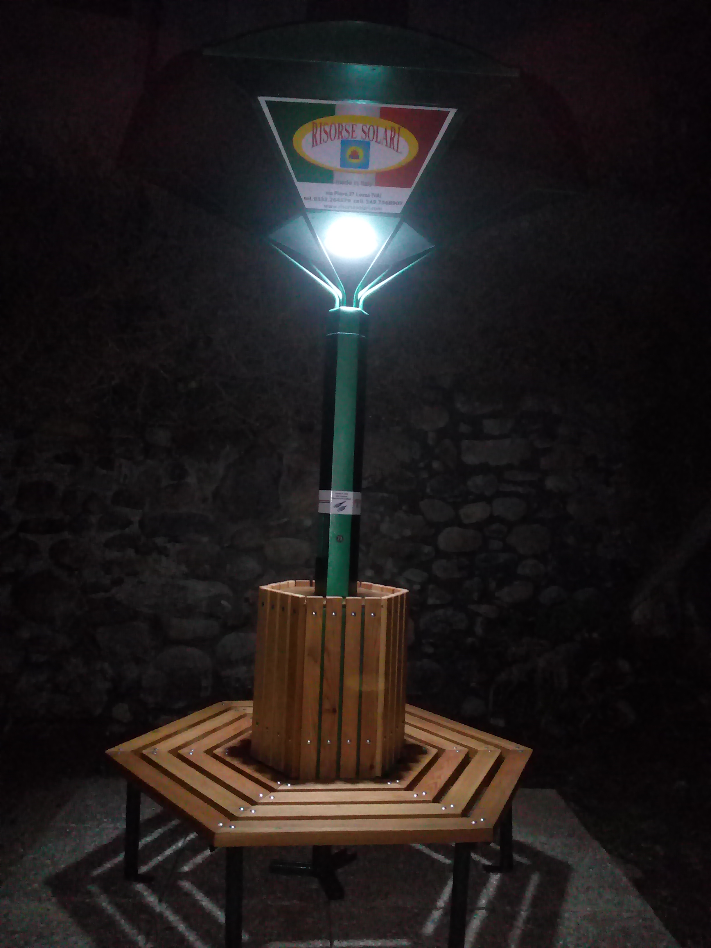 Illuminazione a led per l’utilizzo anche nelle ore notturne, tutto alimentato da pannelli fotovoltaici posizionati sulla copertura con funzione anche di creare zona d’ombra durante il tempo di ricarica del telefono, dispone di spazi per applicare messaggi pubblicitari.